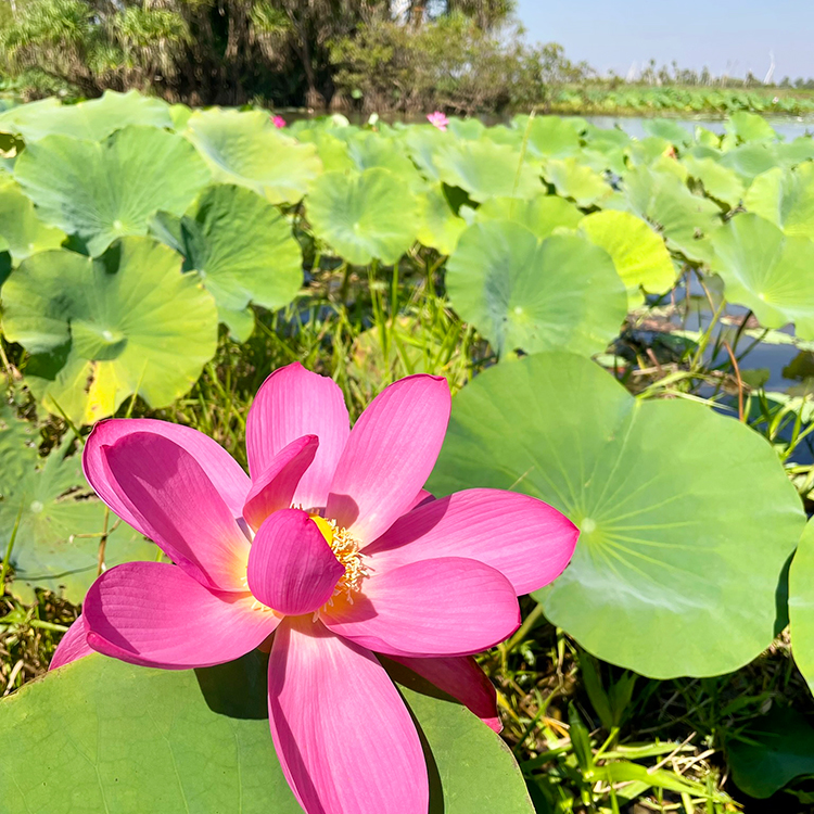 There are plenty of crocodile snack options in the Corroboree Billabong – enormous jabiru storks with their lanky, big-nosed physiques like awkward teenage boys, red-headed jacarnas that skip deftly across lily pads, kites gliding serenely above us in the blue sky.