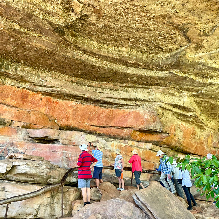While the giant boxing-glove-wearing statue is comical, crocs are no joke in the Northern Territory. The state has the highest concentration of crocodiles anywhere on the planet. Which is why, as we approach our first off-coach activity at the Corroboree Billabong, Pascal gives us the rundown on safety. Never stand by the water’s edge, he says. Saltwater crocodiles, one of largest and most aggressive species, actually prefer fresh water where other species come to drink. We’re to stay minimum of five metres from edge, which should allow enough time to react if croc lunges out of water.