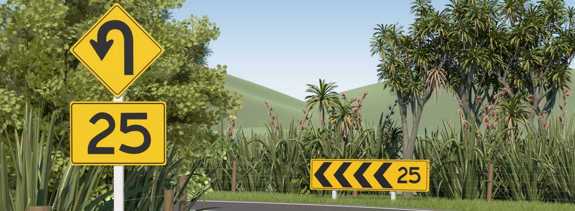 These black chevron-shaped arrows alert motorists to blind corners ahead and indicate which way the road will turn. The signs display advisory speeds and arrows signalling how tight the corner will be. Always slow down and ensure you can come to a complete stop in half the space you can see in front of you as you approach the curve. You never know what you might encounter as you enter the bend.