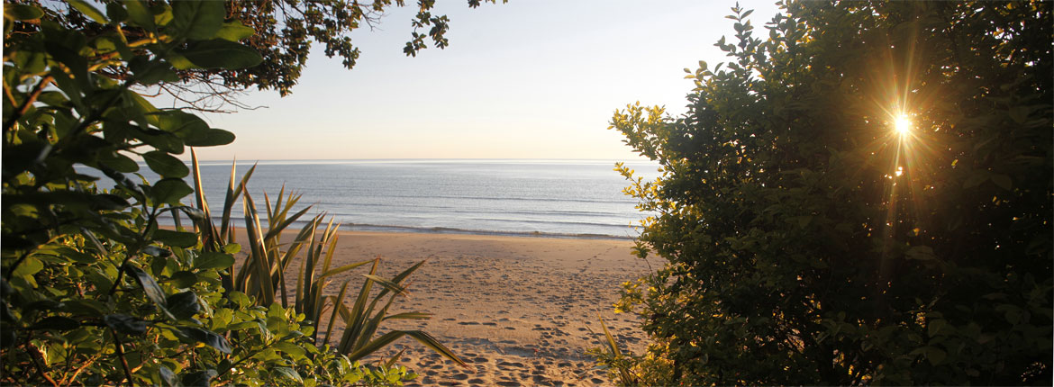 In the morning a tui calls from the pohutukawa that filters dappled light through the blinds, the sound of waves gently lapping the shore. We sip tea on the beach as the children make a dam at a pool fed by a waterfall. We're the only ones on the one- kilometre-long stretch of sand.