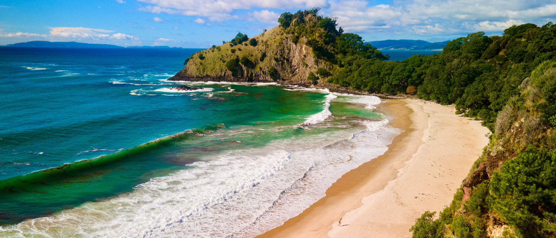 One of the greatest charms of Wainuiototo Bay, aka New Chums Beach, is the fact that it’s so secluded. Metres of white sand stretching away deliciously. Clean, clear water. No buildings. No camping. No road. On a busy day, you might see a flock of seagulls. A 30-minute walk across the estuary at the northern end of Whangapoua Beach and through a cathedral of pōhutukawa will take you to this special spot. Swathes of sand stretching to the sea one way, and into beautiful bush the other.