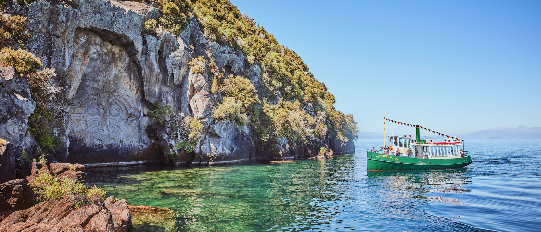 Ngātoroirangi Mine Bay Maori rock carvings, on Lake Taupō, are something else. They tower above the lake, etched into high cliff faces, defying rationale. How did they get there? And how do you get there? They’re only accessible by boat, so that’s one question answered. Various boat tours from Taupō Boat Harbour will take you to Mine Bay to view the large face of Ngātoroirangi and various small companion figures; paddling your own kayak is an even better option because you can get much closer to the carvings. How the art got there is not such a mystery. Although they look ancient, they were carved in the 1970s by a team lead by Matahi Whakataka-Brightwell using power tools.