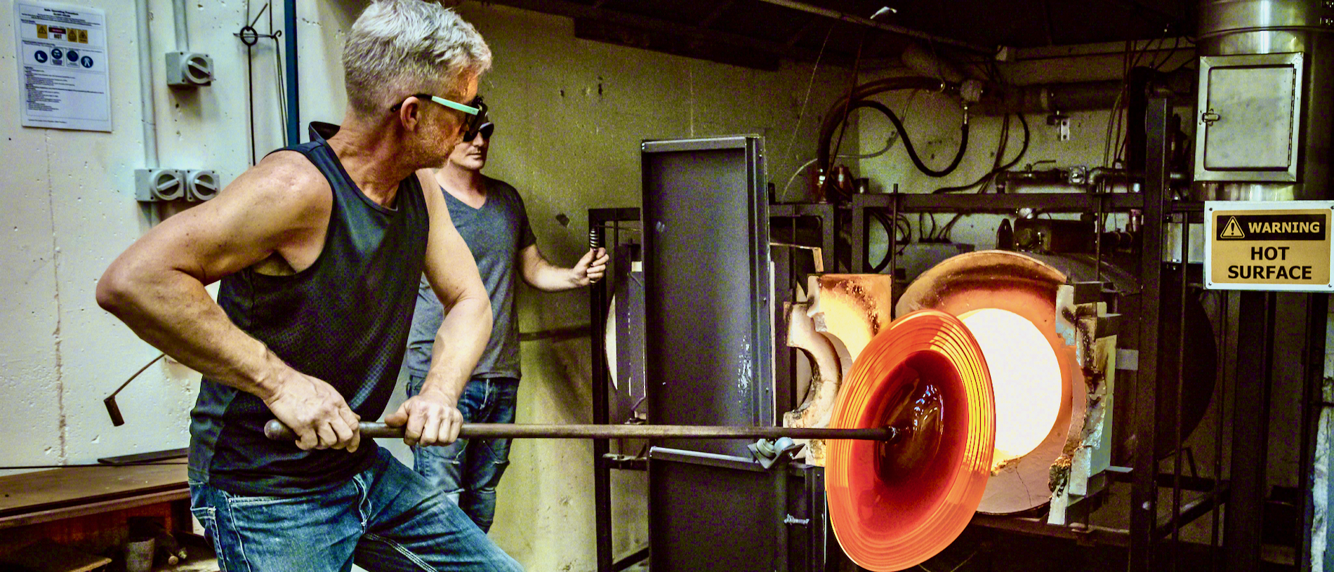 Glass has a working temperature of between 600ºC and 1,100ºC – anywhere below 600ºC, it starts to harden. At New Zealand Glassworks, the gas furnace is set at 1,100ºC and can hold up to an astonishing 300kg of molten glass.