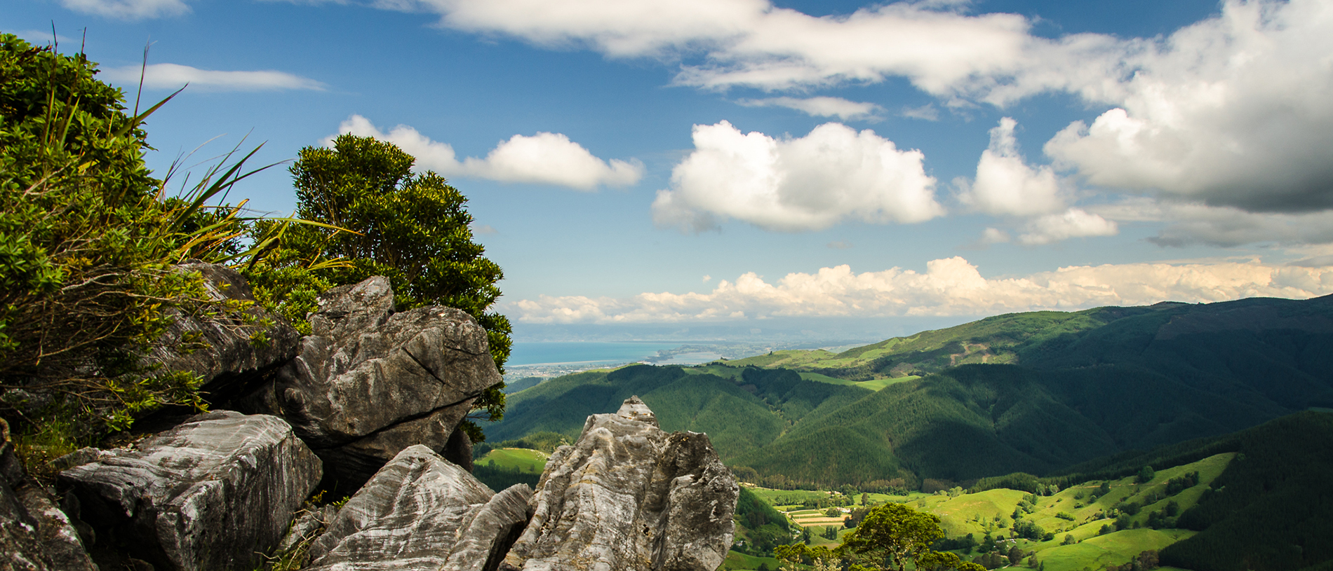 Presently, you emerge onto the tops, and you get a panoramic view of Golden Bay, and the misty peaks of Kahurangi National Park to the west. You’ll also get a pretty good sight of the track ahead as it plunges down into the Gorge.